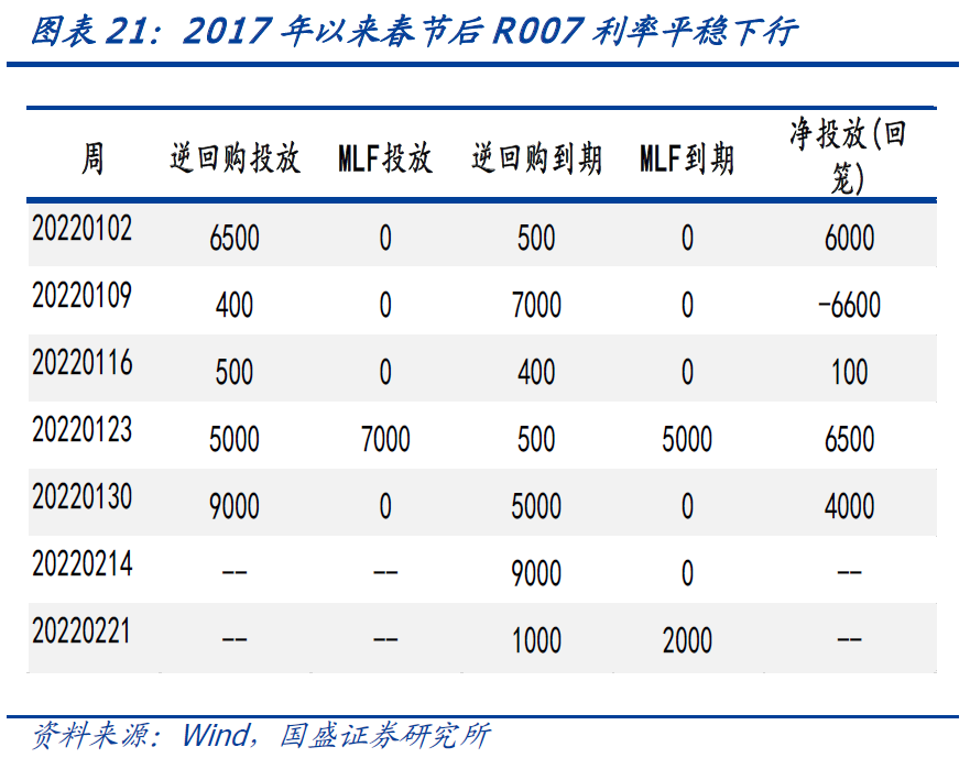 宽信用短期推进依然缓慢,在央行的呵护下节后资金面将保持平稳偏松,债市利率有望继续下行。根据我们的信贷经理调研,由于银行信贷项目储备不足,1月中上旬信贷投放总体不及去年同期的水平。1月18日,在21年金融统计数据新闻发布上,刘国强表示要“金融部门不但要迎客上门,还要主动出击”。在央行的推动下,1月下旬信贷投放节奏有所加快,但是因为项目储备不足,信贷投放结构预计不好。节后第一周国债和地方债发行计划为2438亿元,净融资为-995亿元,地方债供给压力不大。节后第一周有9000亿逆回购到期,央行估计会大幅净回笼,这属于常规正常操作,由于资金需求不强,以往节后的资金面偏松。短期内宽信用还难以有效落地。而央行货币政策将可能进一步宽松,不排除后续继续降息的可能性,当前的总体环境依然利好债市,预计利率可能进一步下行。