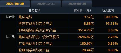 据了解,国科微于2017年上市,属于A股国产芯片概念。目前,公司主营产品为固态存储系列芯片、视频编解码系列芯片、集成电路研发、设计及服务等,占营收比重分别为93.31%、3.69%、2.78%。