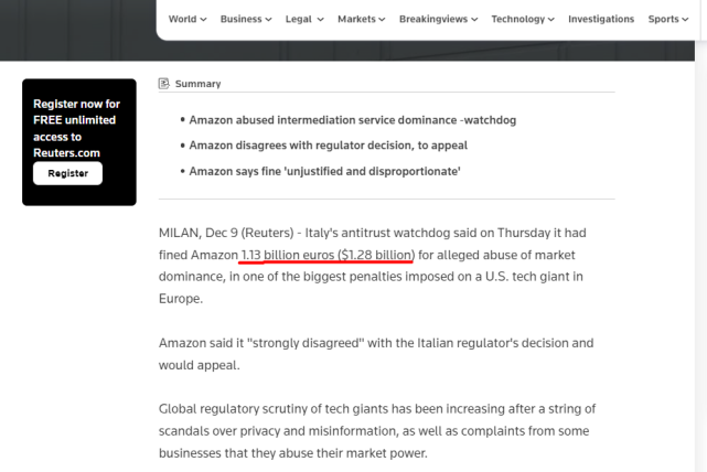 同年12月,意大利反垄断机构表示,亚马逊因涉嫌滥用市场支配地位被处以超过11.28亿欧元的罚款,折合86亿元人民币。
