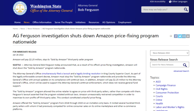 根据华盛顿州总检察长的一项调查,因违反竞争性和涉嫌违反反垄断法,亚马逊将在全国范围内终止其“Sold by Amazon”第三方卖家计划,并向总检察长办公室支付用于反垄断执法的225万美元。