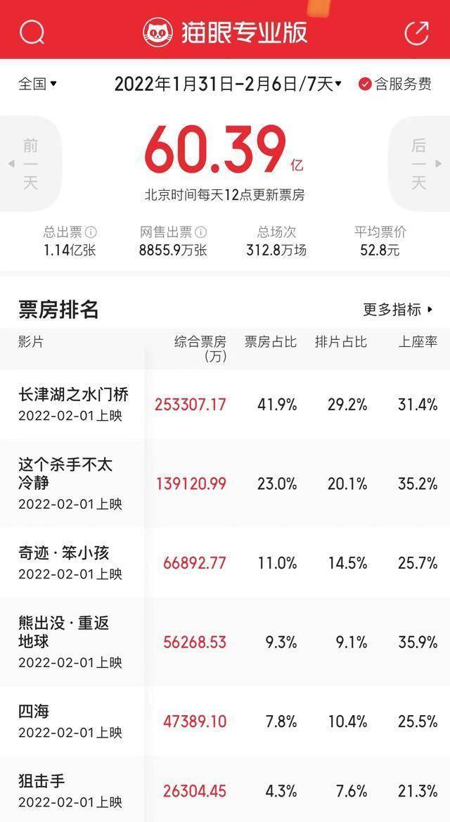 截至2月6日19时50分,2022春节档总票房超60亿元,该数字超过2019春节档总票房59.05亿元,目前位列中国影史春节档总票房第二。