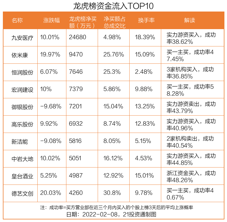 2月8日,上证指数上涨0.67%,深证成指下跌0.98%,创业板指下跌2.45%。盘后龙虎榜数据显示,共有64只个股因当日异动登上龙虎榜,资金净流入最多的是九安医疗(002432.SZ),达2.47亿元。