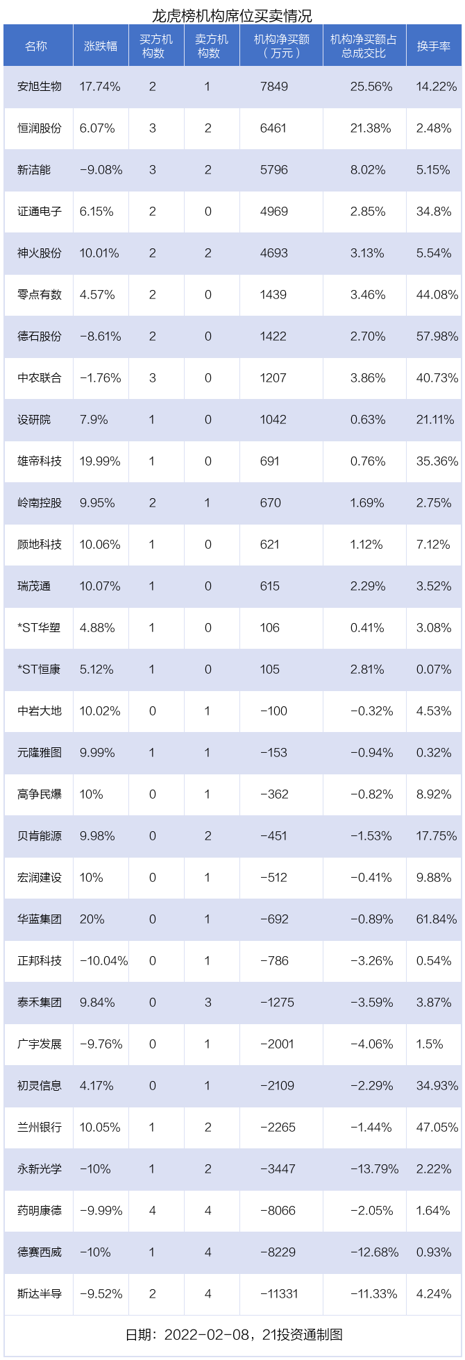 其中,机构净买入金额最多的是安旭生物(688075.SH),当日收盘上涨17.74%,换手率为14.22%。