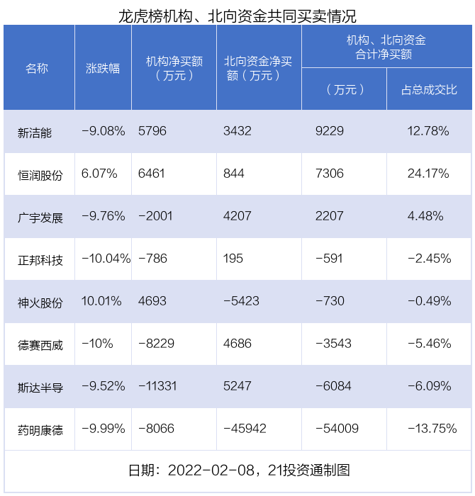 值得注意的是,机构和北向资金共同净买入了新洁能、恒润股份2股;共同净卖出了药明康德;在斯达半导,德赛西威等5股出现分歧,机构净卖出斯达半导1.13亿元,北向资金净买入5246.7万元;机构净卖出德赛西威8229.39万元,北向资金净买入4685.91万元。