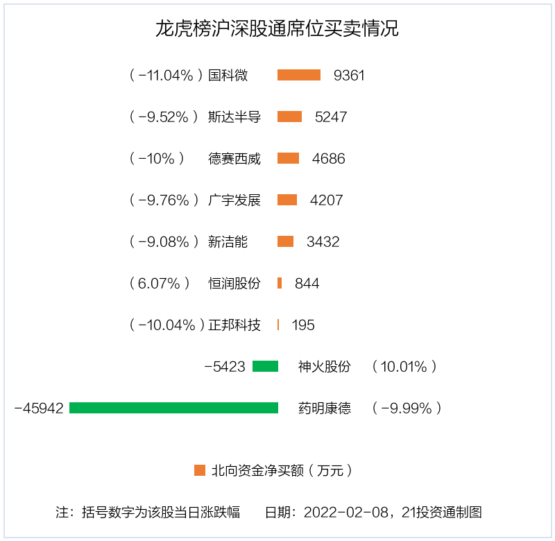 2月8日,北向资金参与龙虎榜中的个股共有9只,合计净卖出2.34亿元。其中沪股通净买入3股,净卖出1股,净卖出3.64亿元;深股通净买入4股,净卖出1股,合计净买入1.3亿元。