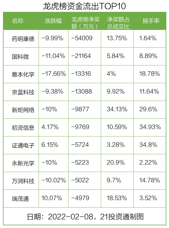 而龙虎榜中资金净流出最多的是药明康德(603259.SH),被净卖出为5.4亿元,占总成交金额的13.75%。药明康德收盘下跌9.99%,换手率为1.64%。