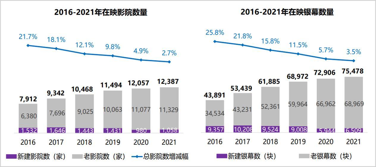 其中,2021年,全国在映影院与在映银幕数量分别为1.24万家与7.55万块,连续两年实现正增长,这是来之不易的。