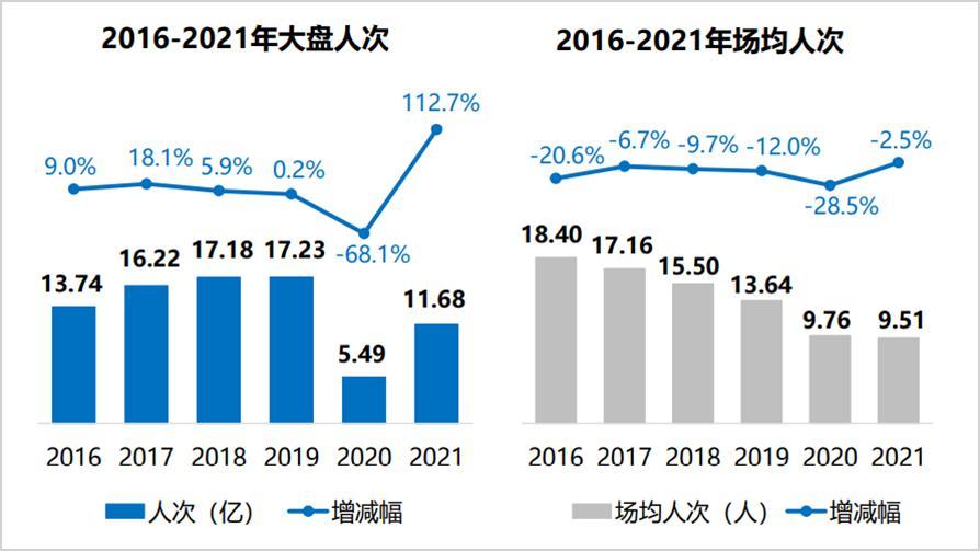 据艺恩数据,2021年走进电影院的人次有11.68亿人/次,仅为2019年的68%;同时,场均人次9.51人,较2019年的13.6人下降了30%以上。