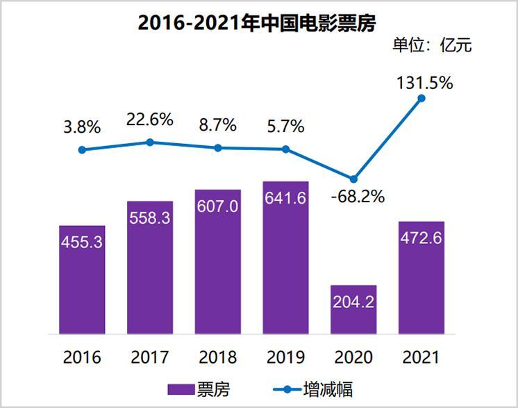 有意思的是,这期间,中国电影行业的票房却不断创新高。2016年-2019年(2020年与2021年受疫情影响剔除掉),总票房从455.3亿元升至641.6亿元,年复合增速达12%。
