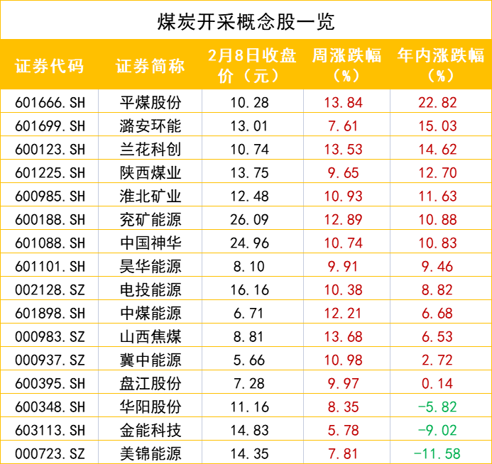 截至2月8日收盘,煤炭开采行业的平煤股份、潞安环能、兰花科创、陕西煤业、淮北矿业、兖矿能源、中国神华等年内涨幅均超过10%,其中平煤股份年内已上涨22.82%。
