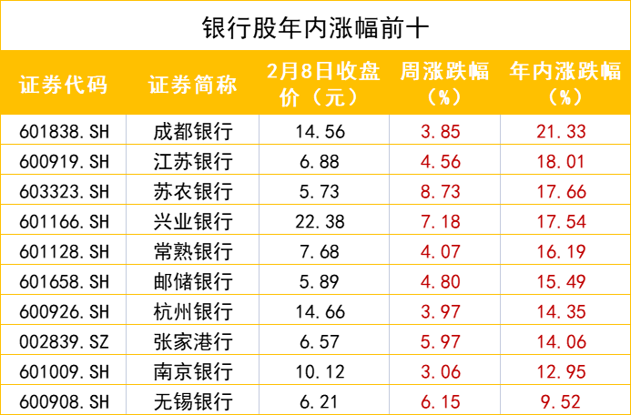 另一方面,年内的降息降准也利好银行的经营和债券的价格上涨,银行股股价大多出现抬升。成都银行、江苏银行、苏农银行、兴业银行年内涨幅居前,其中成都银行的涨幅高达21.33%。