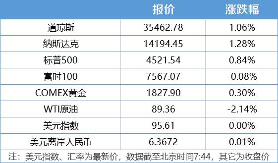 1、美股三大股指集体收涨。道指收涨1.06%,纳指收涨1.28%,标普500指数收涨0.84%。