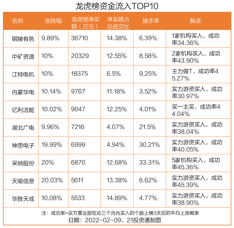 2月9日,上证指数上涨0.79%,深证成指上涨1.55%,创业板指上涨1.3%。盘后龙虎榜数据显示,共有36只个股因当日异动登上龙虎榜,资金净流入最多的是铜陵有色(000630.SZ),达3.67亿元。