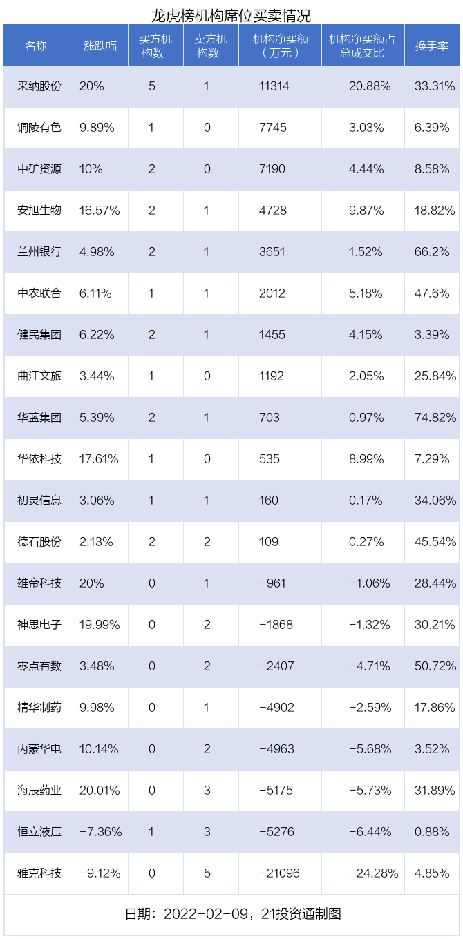 2月9日,20只个股龙虎榜出现了机构的身影,机构合计净卖出5853.65万元。具体来看,机构净买入12股,净卖出8股。