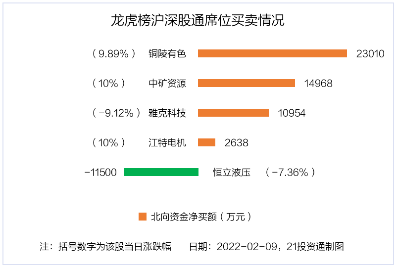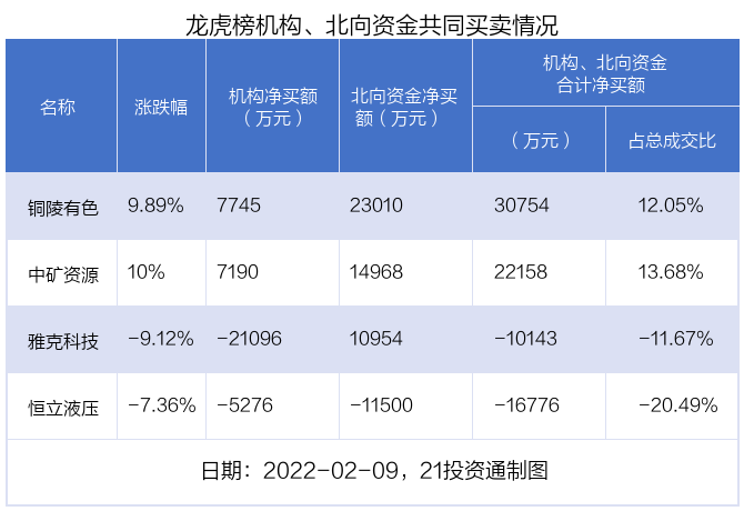 值得注意的是,机构和北向资金共同净买入了铜陵有色、中矿资源2股;共同净卖出了恒立液压;在雅克科技上出现分歧,机构净卖出雅克科技2.11亿元,北向资金净买入1.1亿元。