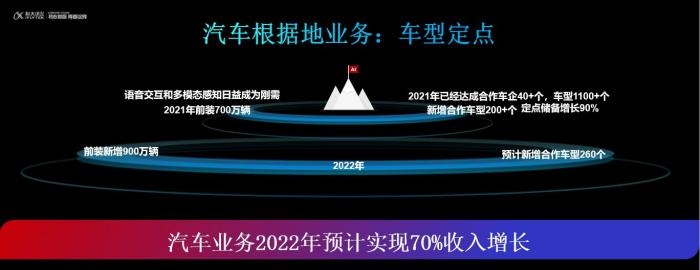 核心技术的明显优势,加上多年的市场耕耘,给讯飞带来了长足发展。据年会公开内容可以看到,2021年,随着语音交互和多模态感知日益成为刚需,讯飞实现汽车前装合作700万辆,2022年预计将再新增900万辆。2021年已经达成合作车企40+个,车型1100+个,相较于2020年新增合作车型200+个,2022年预计将再新增合作车型260个,而汽车业务2022年预计实现70%地收入增长。