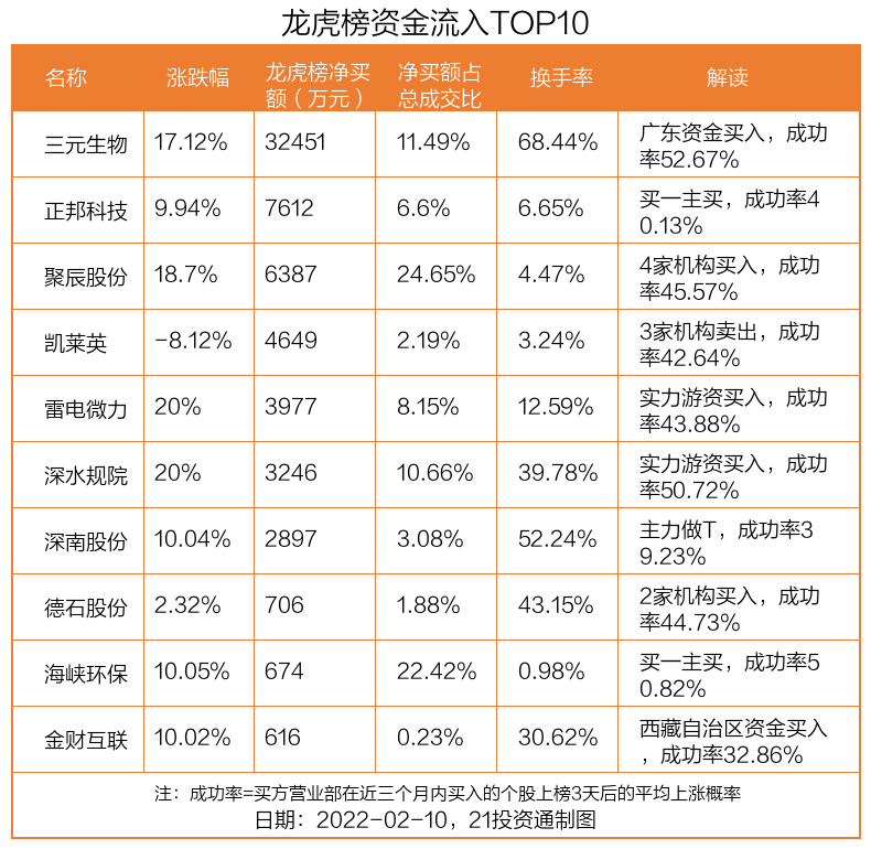 2月10日,上证指数上涨0.17%,深证成指下跌0.73%,创业板指下跌1.98%。盘后龙虎榜数据显示,共有38只个股因当日异动登上龙虎榜,资金净流入最多的是三元生物(301206.SZ),达3.25亿元。