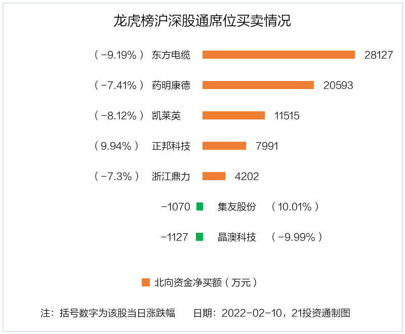 2月10日,北向资金参与龙虎榜中的个股共有7只,合计净买入7.02亿元。其中沪股通净买入3股,净卖出1股,合计净买入5.19亿元;深股通净买入2股,净卖出1股,合计净买入1.84亿元。