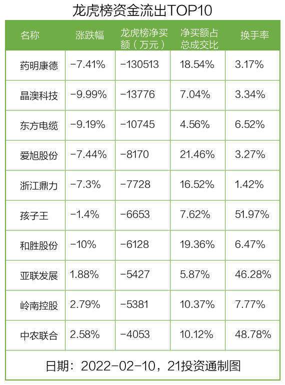 而龙虎榜中资金净流出最多的是药明康德(603259.SH),被净卖出为13.05亿元,占总成交金额的18.54%。药明康德收盘下跌7.41%,换手率为3.17%。