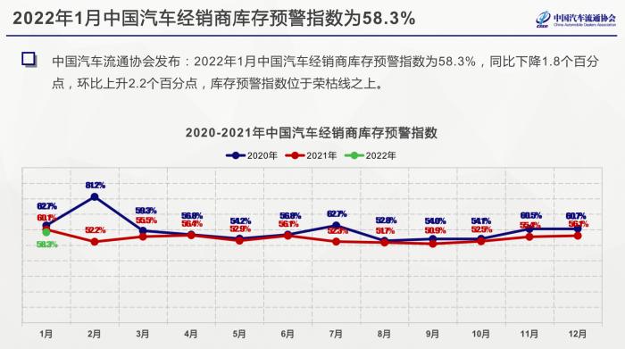 中国汽车流通协会发布的最新一期“中国汽车经销商库存预警指数调查”VIA(Vehicle Inventory Alert Index)显示,2022年1月中国汽车经销商库存预警指数为58.3%,同比下降1.8个百分点,环比上升2.2个百分点,库存预警指数位于荣枯线之上。
