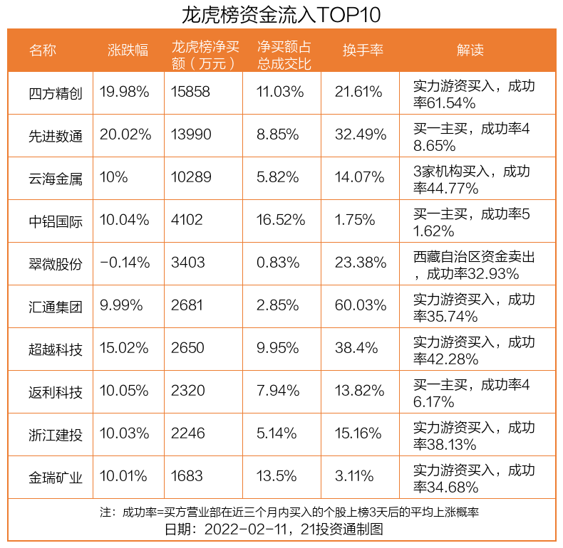 2月11日,上证指数下跌0.66%,深证成指下跌1.55%,创业板指下跌2.84%。盘后龙虎榜数据显示,共有43只个股因当日异动登上龙虎榜,资金净流入最多的是四方精创(300468.SZ),达1.59亿元。
