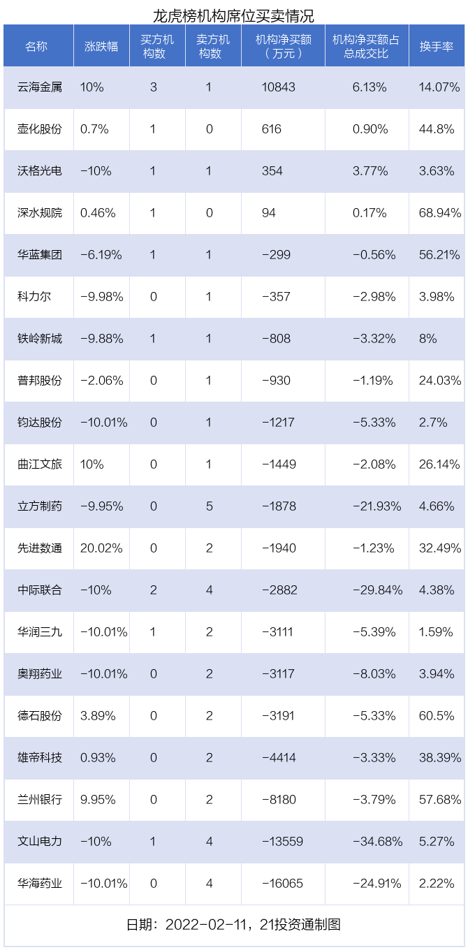 2月11日,20只个股龙虎榜出现了机构的身影,机构合计净卖出5.15亿元。具体来看,机构净买入4股,净卖出16股。