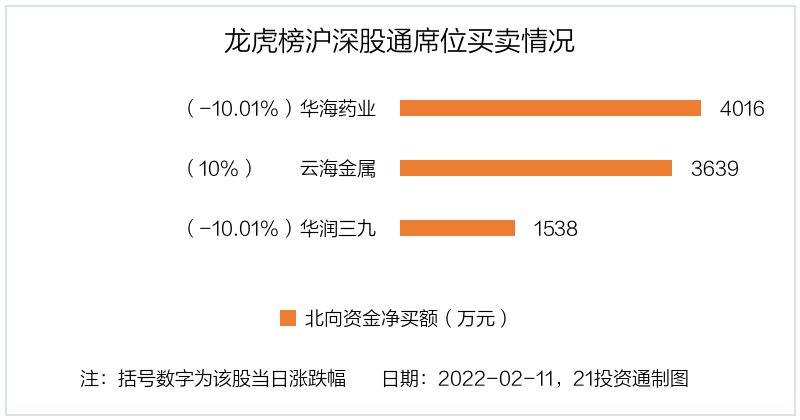 2月11日,北向资金参与龙虎榜中的个股共有3只,合计净买入9192.49万元。其中沪股通净买入1股,净买入4015.64万元;深股通净买入2股,合计净买入5176.85万元。