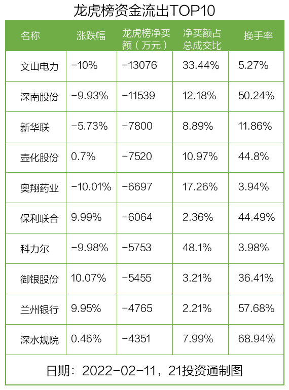 而龙虎榜中资金净流出最多的是文山电力(600995.SH),被净卖出为1.31亿元,占总成交金额的33.44%。文山电力收盘下跌10%,换手率为5.27%。