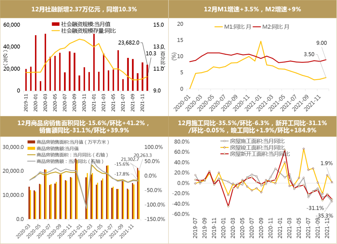 金融地产:中性,银行景气度有望提升,地产需求边际修复。银行:12月信贷不及预期,社融增速回升,M1-M2剪刀差持平。近期MLF、LPR相继下调,净息差影响有限,银行业绩快报可观,关注后续银行估值修复可能。券商:两融景气度下行,映射市场风险偏好下降,两市成交额区间震荡,新发基金规模适中。地产:12月地产销售数据边际有所修复,近期LPR的下调将边际降低按揭成本,购房需求有望受催化。保险:12月四大主要险企新增保费边际有所修复。一季度开门红预期较低,保险板块估值短期持续承压。