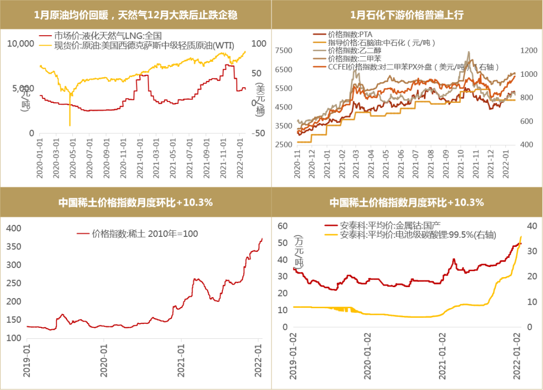 资源原材料:中性,原油持续涨价,能源金属、稀土高景气,基建产业链预期升温。石油石化:受地缘政治风险和经济复苏预期影响,石油石化产业链价格普升,景气度向好;有色:工业金属偏弱,能源金属、稀土受益新能源下游需求供需偏紧格局延续,稀土供给延续整合,价格持续攀升;煤炭:1月价格修复后或趋稳,新能源转型煤气预期向好;钢铁、建材明确受益基建投资的加速落地,景气度回升程度待验证;光伏玻璃需求高带动涨价预期。