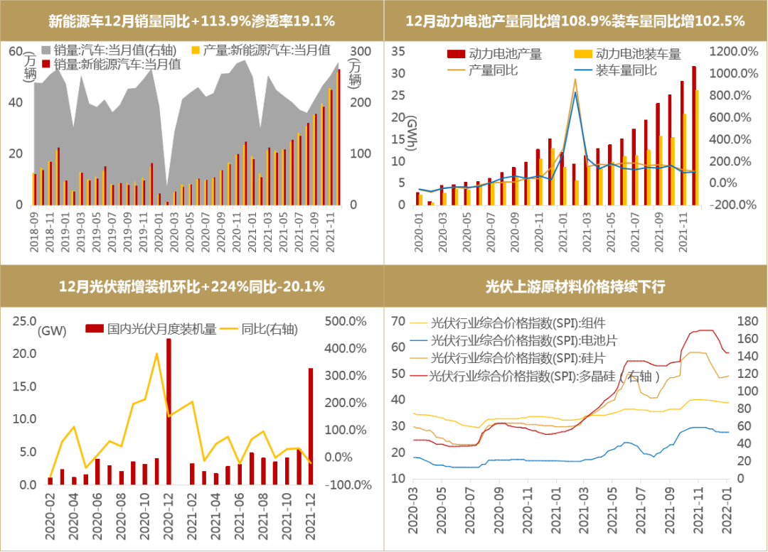 制造:中性,新能源车电力设备需求强劲。汽车:新能源车21年全年销售350万辆,2022年增长动力依然强劲,自主品牌1月销量普遍高增长;电力设备:动力电池盈利有望修复;受上游降价催化,风光装机将持续高增;国防军工:风险偏好受业绩担忧下降,中长期景气逻辑不变;机械设备:工程机械总需求偏弱,修复需待基建项目落地;轻工制造:纸浆价涨跌互现,家居进入淡季,景气拐点待观察。