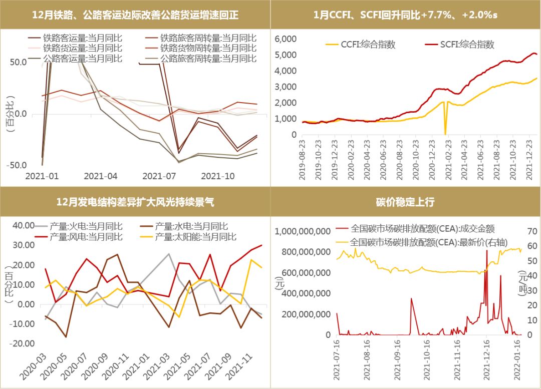 现代服务:中性,集运景气持续上行,风光发电高增加速电力结构调整。交运方面,物流收入显著放缓,货运客运承压疫情影响,依托中国出口景气集运指数持续上行。公用事业方面,用电量发电量同比双降,水电火电调整显著,风光电逆势高增,电力结构加速向新能源倾斜。环保方面,12月以来碳价稳步上行,政策端持续支持污染治理、生态修复等行业发展。建筑装饰方面,宏观层面稳增长政策抓手明确,专项债2022年H1可用额度充足基建类投向占比预期提升,头部建筑央企订单充足,2022年盈利预期向好。