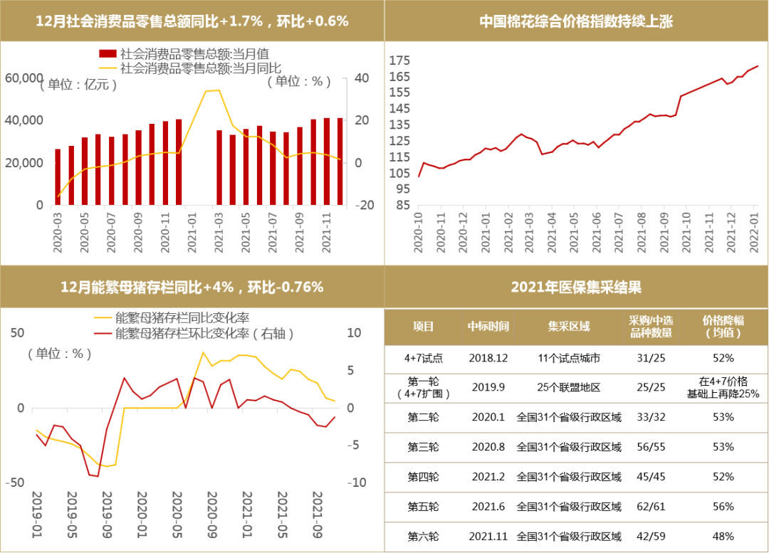 消费:中性偏淡,医药细分领域景气度分化,必选消费筑底,可选消费复苏缓慢。家电、纺服:社零增速趋缓,家电服装零售承压,基本面筑底。农林牧渔:猪价继续回落,春节后生猪产能去化节奏预计加快。鸡价处于2年低位,筑底阶段。白酒:终端动销逐渐改善,市场批价坚挺,经销商库存相对良性,整体基本面向好,估值进入价值区间。医药:疫情持续脱敏,新增高峰已过,新冠口服药的景气度有望提升。第七批国家药品集中采购开启。