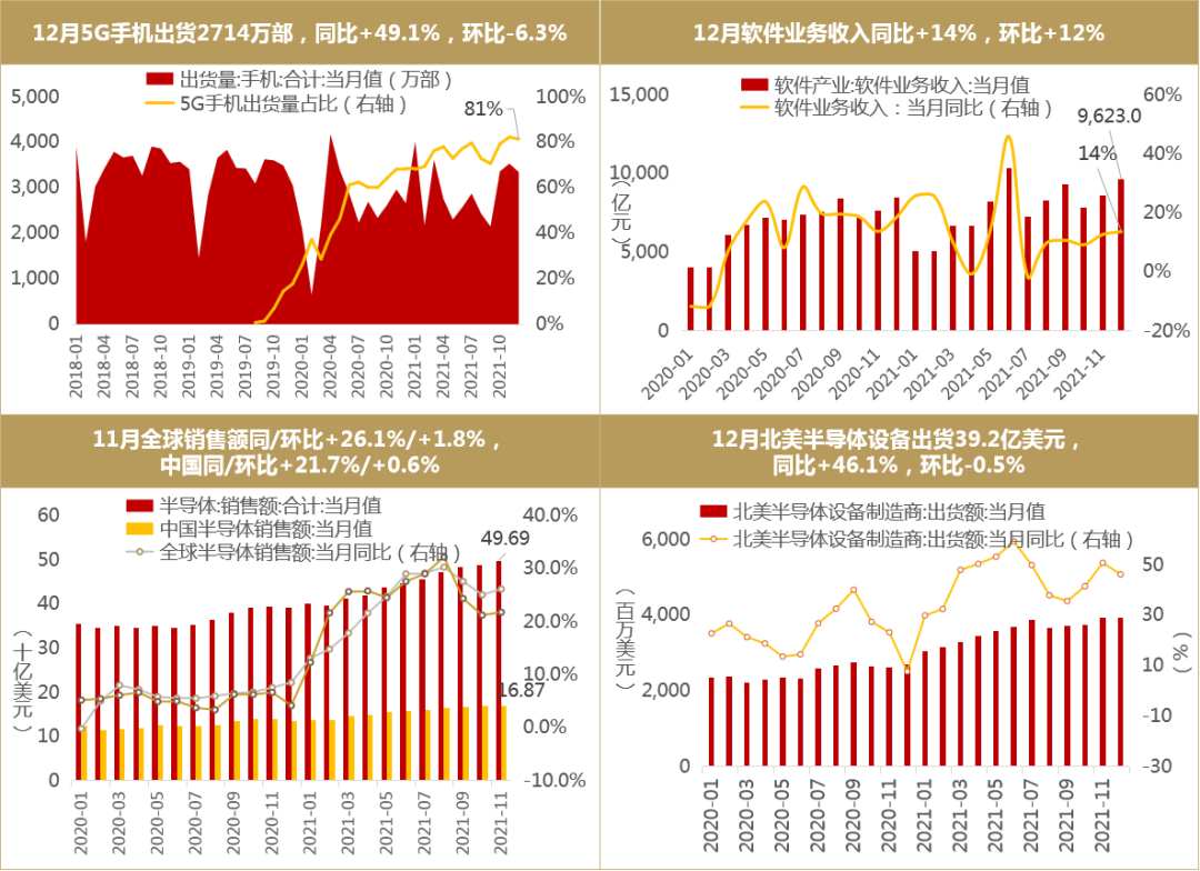 科技成长:中性偏多,通信景气度边际下行,计算机、电子高景气。通信:5G手机出货同比高增,运营商数据映射需求端边际放缓,基建投资扩大下,5G建设需求韧性。计算机:12月软件业务收入维持增长,基建投资扩大、多省设立数字经济核心产业增加值量化指标,政策需求释放。文化传媒:影视表现低于去年同期。国产手游2021年海外表现可观,收入增速与2017、2018年整体持平。电子:半导体需求端仍强势,短期内供需紧平衡进一步维持。1月NAND、DRAM存储器价格回升显著,源于西安疫情所导致的阶段性供小于求。台积电21Q4业绩超预期,2022年将加大先进制程的扩产,晶圆代工产业链维持高景气。