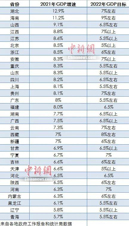 民生银行首席研究员温彬对中新财经记者表示,各个省份明确2022年经济增速等目标,虽然多地目标较去年有所下调。但基本上普遍在5.5%以上,平均在6%左右的水平。