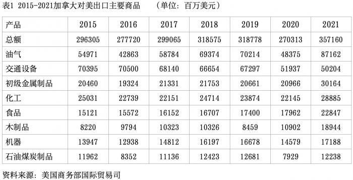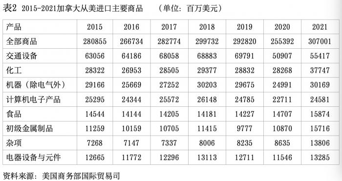 美国还是加拿大第一大进口来源地。2021年,加拿大从美国进口的交通设备、化工品、机器、计算机电子产品、食品、初级金属制品、杂项和电器设备及元件占总进口额的67.30%。加拿大进口产品依然以工业制成品为主,反映了美加两国产业结构的差异。与2015年相比,2021年加拿大交通设备进口额和占比均呈现明显的下降趋势。安大略省对美国进口商品需求较大。2020年,安大略省的进口贸易达4127.59亿加元,其最大进口来源地分别为美国(52.2%)、中国(13.5%)、墨西哥(6.9%)、日本(2.9%)、德国(2.5%),主要出口产品分别为汽车及配件(17.6%)、机械设备(14.6%)、电机(11%)、贵金属与宝石(5.8%)、药品(4.6%)。