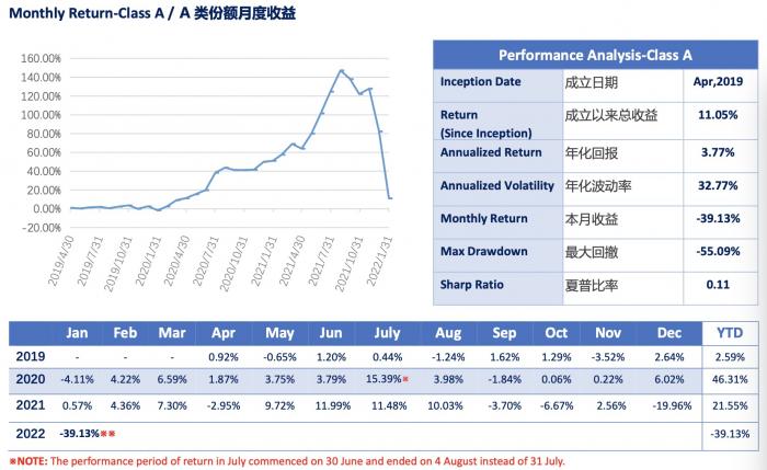 2022年1月回撤高达39.13%的Ubi Asia Fund正是这样的一款产品,该基金成立于2019年4月,年化回报为3.77%,成立以来的最大回撤为55.09%。
