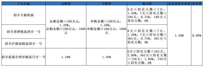 产品收费上,与招银理财此前的三款权益类产品费率大体相同,费率维持较高水平。产品收取固定投资管理费1.5%/年和托管费0.08%/年,认/申购费和赎回费均采用分级收费形式。其中,针对认/申购金额小于100万元的投资者,认购费率相比申购费率有一定减免,认购费率为1.2%/年,此后若费率无调整情况下,申购费率则为1.5%/年。