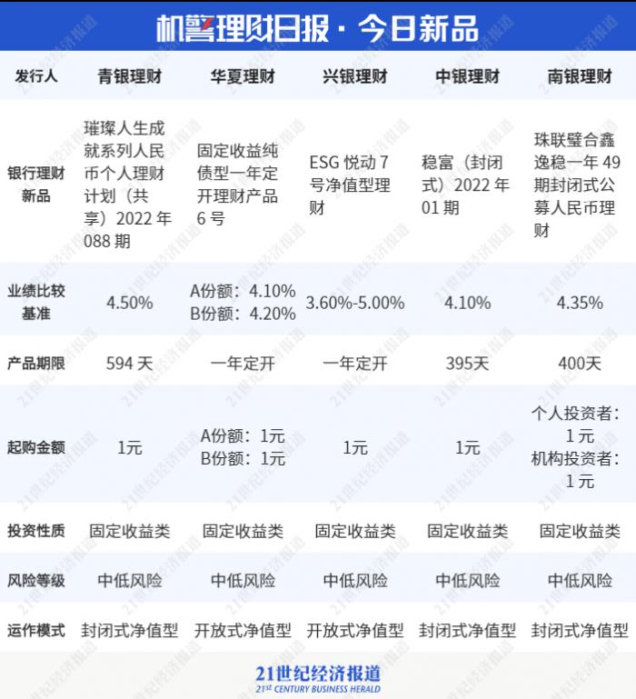 南财理财通课题组选取5只近期发售新品供参考。据南财理财通数据显示,近期,兴银理财“ESG 悦动7号净值型理财产品”值得关注。该产品业绩比较基准为3.60%-5.00%,投资性质为固定收益类,运作模式为开放式净值型,产品起购金额为1元,风险等级为中低风险。在投资策略上,该产品将采取利率策略、信用策略,判断不同债券在经济周期的不同阶段的相对投资价值,确定不同债券在组合资产中的配置比例,实现组合的稳健增值。并且该产品还将采用ESG投资理念,在追求投资业绩的同时,影响或者推动企业社会责任的履行,促进社会的和谐发展。