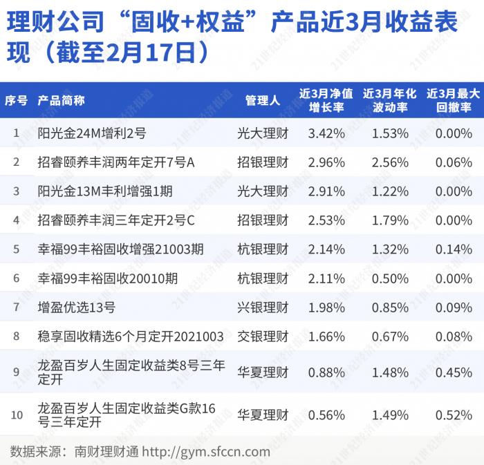 理财公司“固收+权益”公募型产品近3月净值增长率榜单