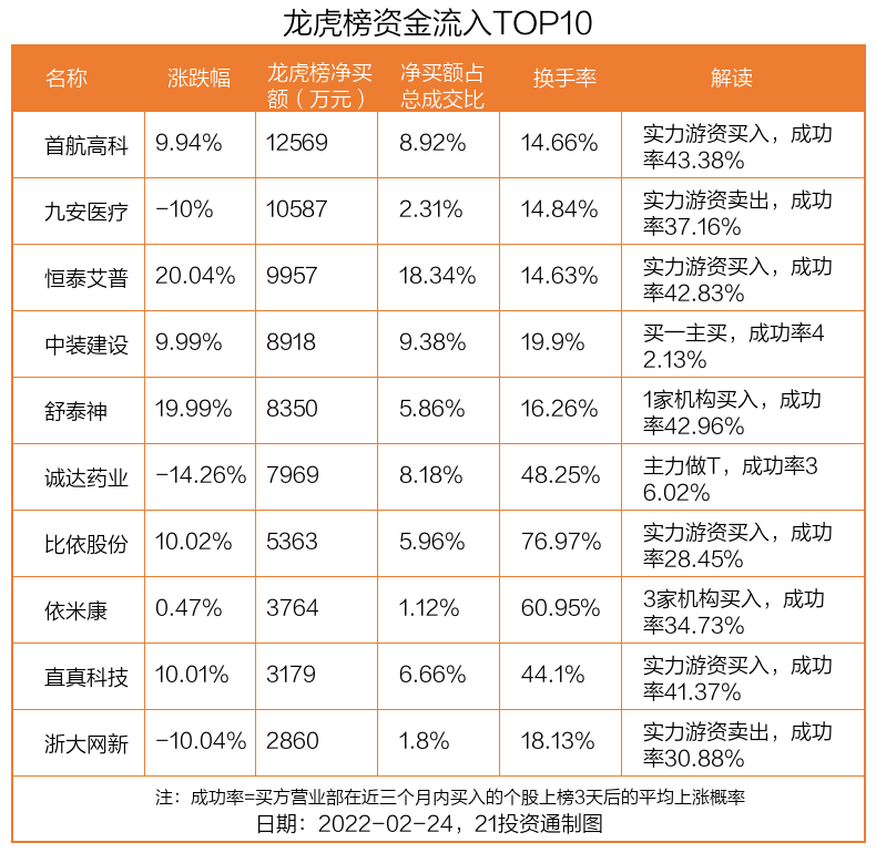 2月24日,上证指数下跌1.7%,深证成指下跌2.2%,创业板指下跌2.11%。盘后龙虎榜数据显示,共有49只个股因当日异动登上龙虎榜,资金净流入最多的是首航高科(002665.SZ),达1.26亿元。