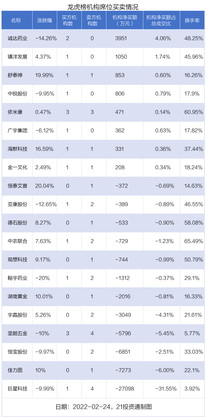 其中,机构净买入金额最多的是诚达药业(301201.SZ),当日收盘下跌14.26%,换手率为48.25%。前五大买卖营业部中有2家机构,为合计净买入3951万元,占总成交金额的4.06%。
