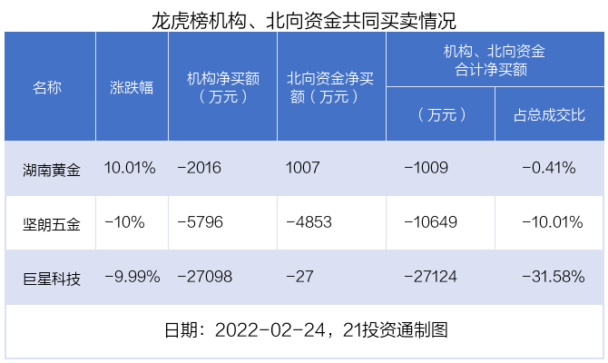值得注意的是,机构和北向资金共同净卖出了巨星科技、坚朗五金等2股;在湖南黄金上出现分歧,机构净卖出湖南黄金2015.79万元,北向资金净买入1006.91万元。
