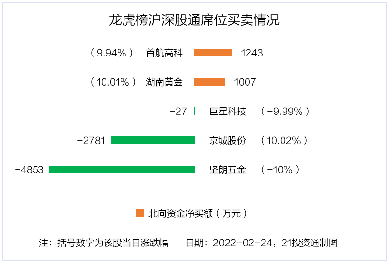 2月24日,北向资金参与龙虎榜中的个股共有5只,合计净卖出5411.46万元。其中沪股通净卖出1 股,净卖出2781.26万元;深股通净买入2 股,净卖出2 股,合计净卖出2630.2万元。