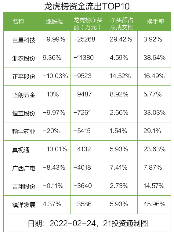 而龙虎榜中资金净流出最多的是巨星科技(002444.SZ),被净卖出为2.53亿元,占总成交金额的29.42%。巨星科技收盘下跌9.99%,换手率为3.92%。