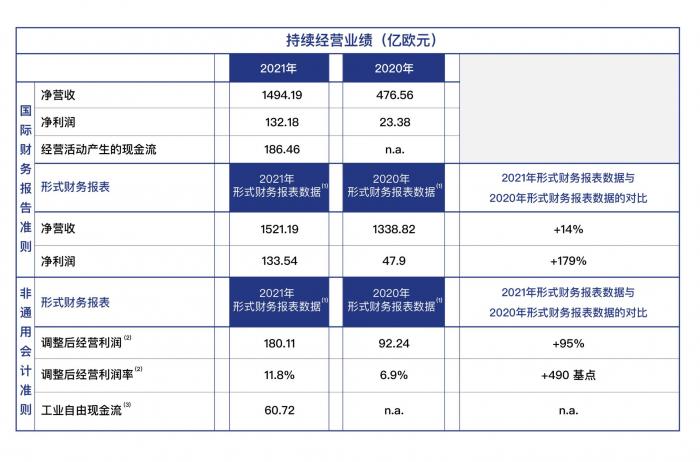 财报显示,2021年集团净营收为1520亿欧元,较合并前增长14%;整后经营利润增180亿欧元,调整后经营利润率达11.8%,各板块全面实现盈利;净利润高达134亿欧元,同比增长近两倍。按照规定,待股东批准后,集团将支付普通股股息33亿欧元。