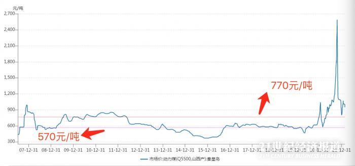 (秦皇岛Q5500动力煤市场价格走势图,并标记出价格位于570-770元/吨的区间图)