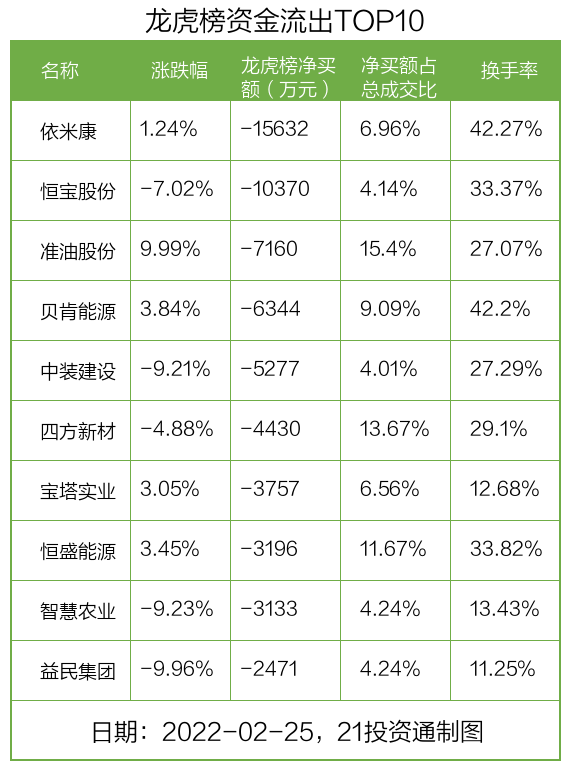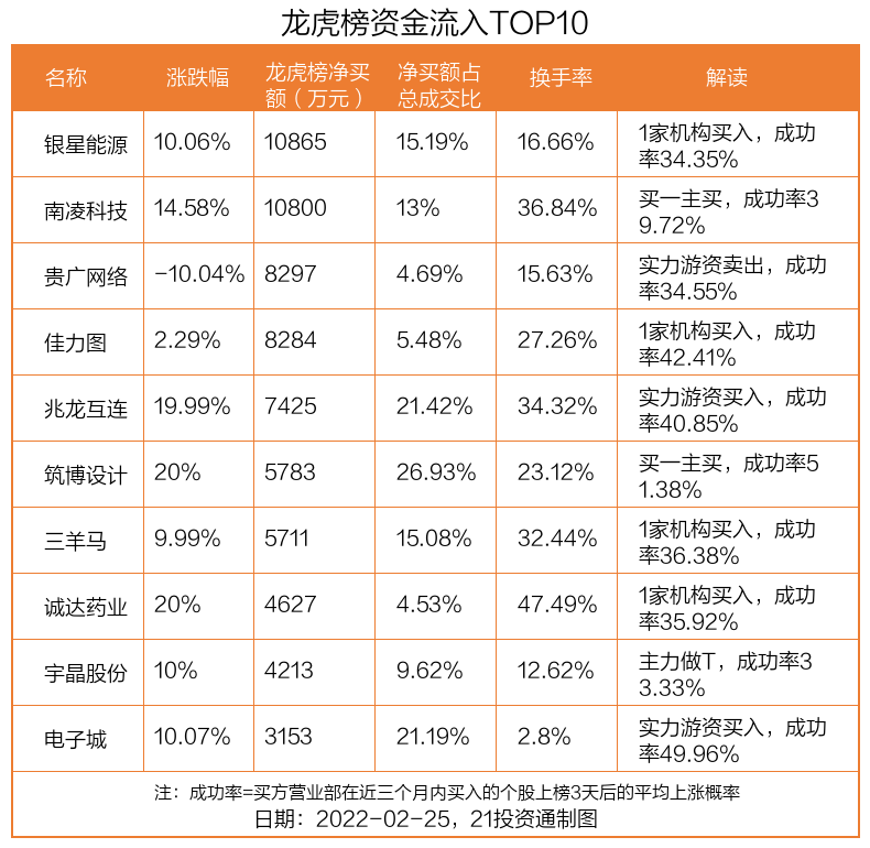 2月25日,上证指数上涨0.63%,深证成指上涨1.21%,创业板指上涨2.58%。盘后龙虎榜数据显示,共有43只个股因当日异动登上龙虎榜,资金净流入最多的是银星能源(000862.SZ),达1.09亿元。