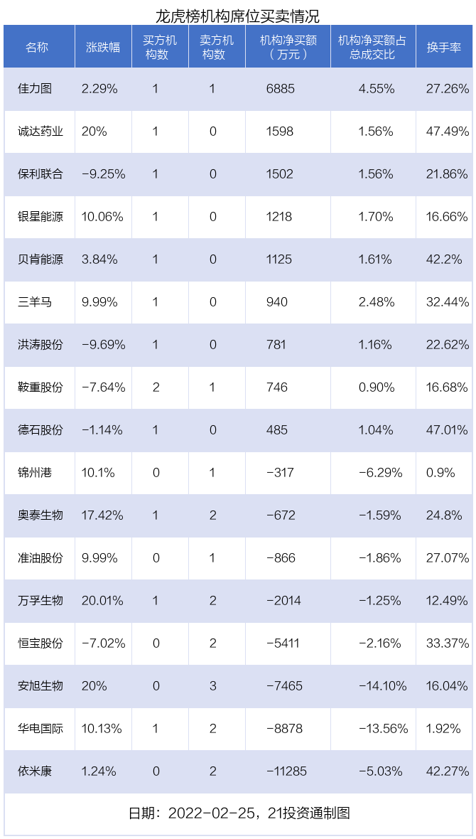 其中,机构净买入金额最多的是佳力图(603912.SH),当日收盘上涨2.29%,换手率为27.26%。前五大买卖营业部中有2家机构,合计净买入6885万元,占总成交金额的4.55%。