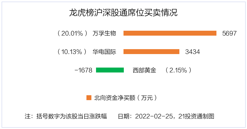 2月25日,北向资金参与龙虎榜中的个股共有3只,合计净买入7452.96万元。其中沪股通净买入1 股,净卖出1 股,合计净买入1755.64万元;深股通净买入1 股,净买入5697.32万元。